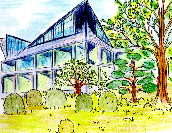 松江城西側の堀に面した閑静な場所にある島根県立図書館は、建築家菊竹清訓氏の設計です。コンクリート打放しの壁、ガラスや鉄骨で構成された切妻屋根を思わせるエントランスなど、モダニズムの真髄とも言える素材とダイナミックなデザイン。中央の吹抜けホールには、2階部分を一周できる回廊があります。建物を外から見てもすばらしいものです。堀川めぐりの船から見た方達からは、堀に向かって雁行する美しい姿が印象だと感想を寄せられていました。