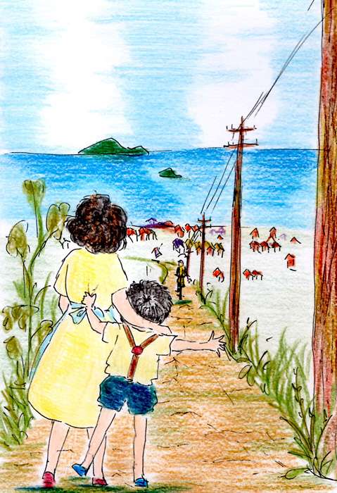 村には鉄道もなくバスが北の海辺の町から南の町へ走っていた。その本屋は村を二つくらい通り抜けた海辺にあって、本のお兄さんはゆっくり上り坂の私の家までのぼってくるのであった。家の前の道で遠くに海や小豆島が見えるところに本屋があると聞いて、立ちつくして待った。