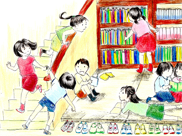 子どもの姿は本当に楽しい。ごろりごろりと回ったり、腹ばいになって読んだり。クスクスッと笑ったり、あくびをしたり……。